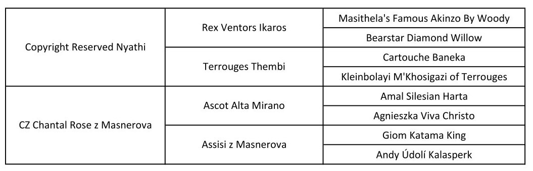 Štěňátka Chantal Rose a Kaktuse očekáváme zdravá, velmi atraktivní, s krásnou hlavou, výborným hrudníkem a předhrudím, skvělou kostrou i úhlením. Spojením jejich rodokmenů vznikne typický představitel plemene Rhodéského ridgebacka s africkými, americkými či australskými předky. Jejich povaha bude naprosto úžasná a vyrovnaná. Toto spojení předurčuje výstavně i sportovně úspěšná štěňátka, která budou milovat svoji rodinu.